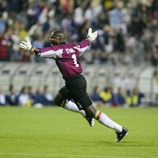 Senegal’s goalkeeper Tony Sylva celebrates his side’s famous win against France at the 2002 Fifa World Cup. Simon Bruty/Anychance/Getty Images